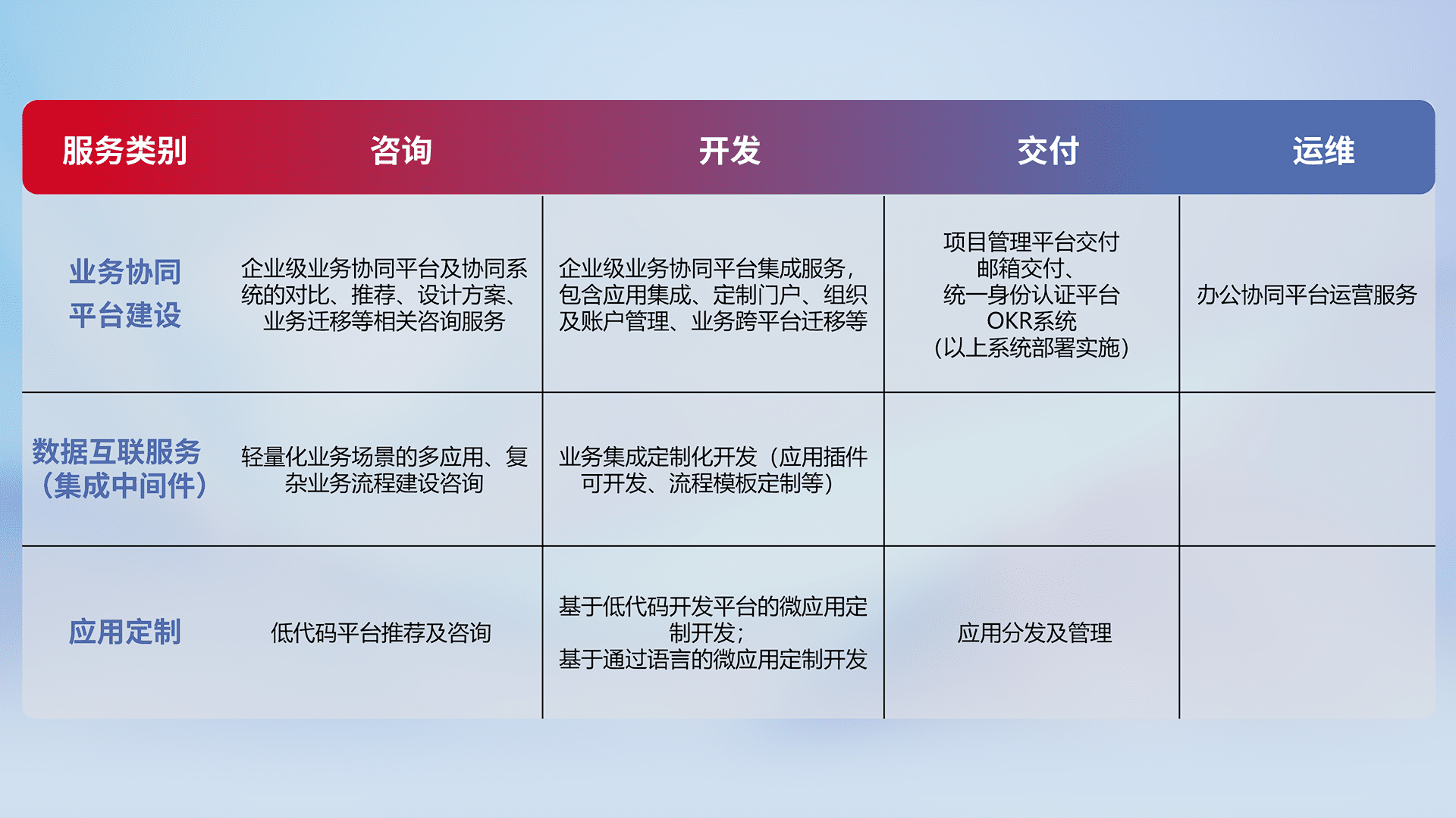 针对钉钉、、企微、、、、IDaas等平台级产品提供产品的规划、、、、方案、、、交付、、、定制化开发等服务,,,实现如统一协同办公、、、、智能客户服务、、混合会议管理、、、智能数据查询、、、等业务场景,,实现数字化转型。。